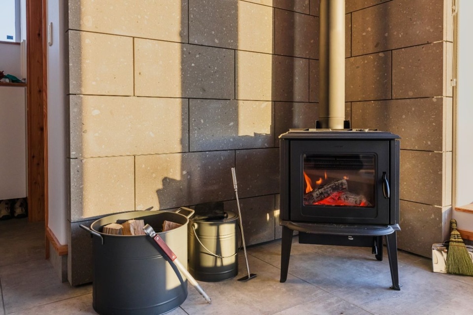 ご主人の要望で少し大きめサイズの薪ストーブを選択。床は磁器タイル、壁は札幌軟石を使用しています。