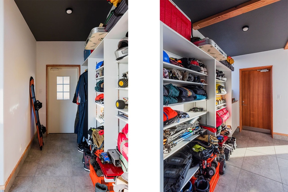 農作業着のまま入れる裏玄関(左)とカウンターの設置された表玄関(右)。玄関はそのまま広々とした土間に続いています。大容量の棚に収納されているのは、キャンプ用品やヘルメットなどアウトドア好きというご主人の趣味のアイテムたちです。居室部分から緩やかに区切られた土間に設置したことで、単なる収納ではなく“基地”感のある趣味のコーナーとなりました。