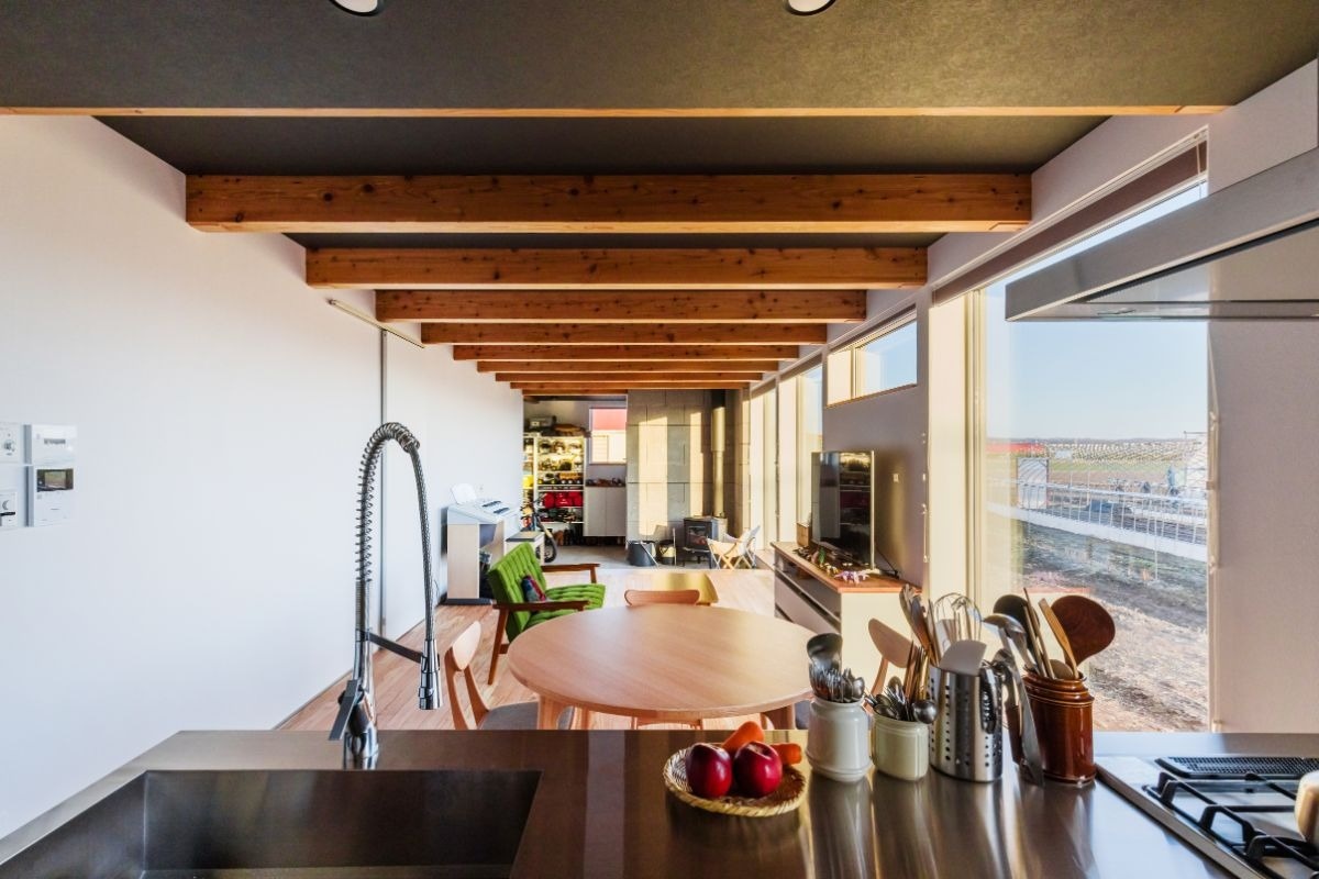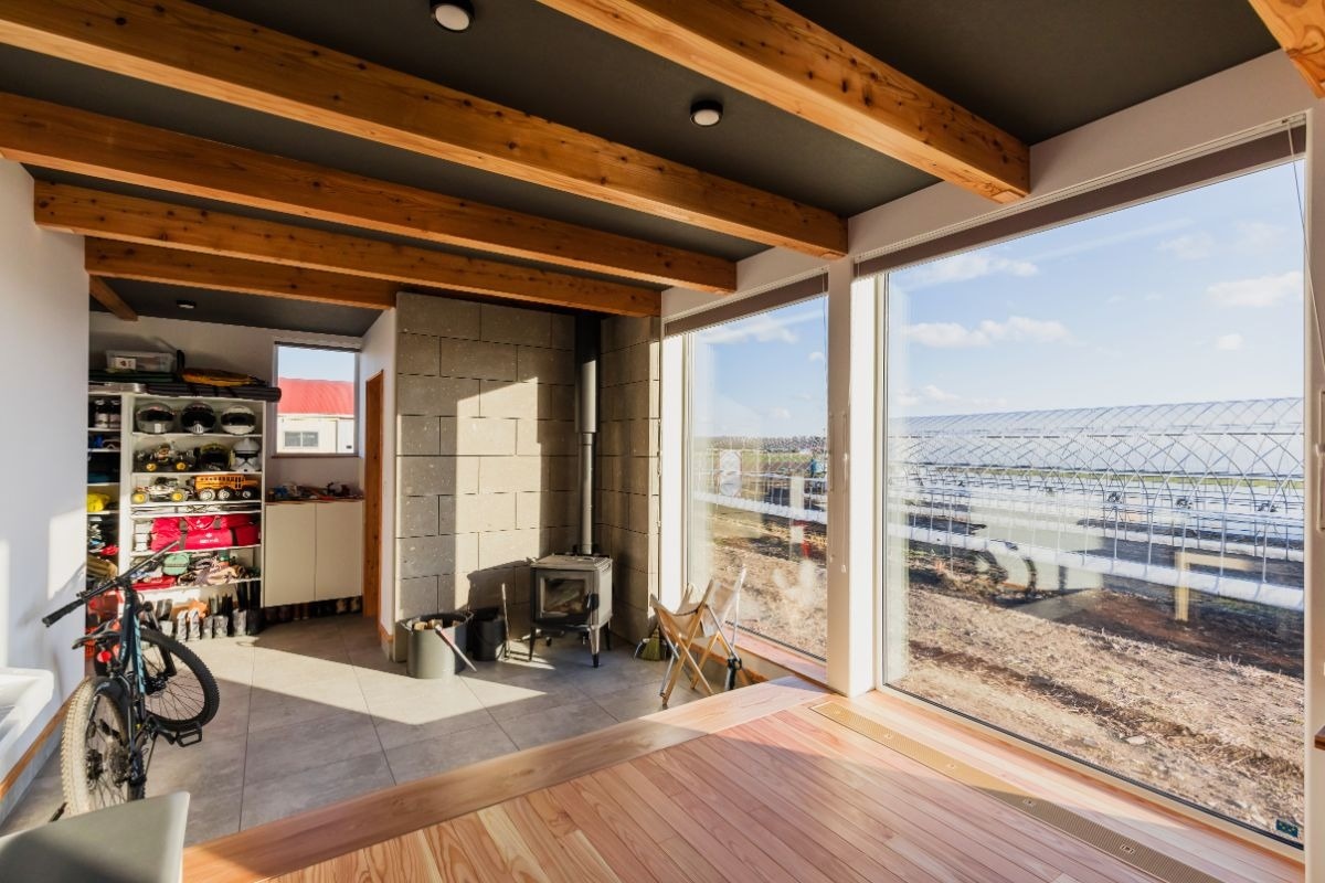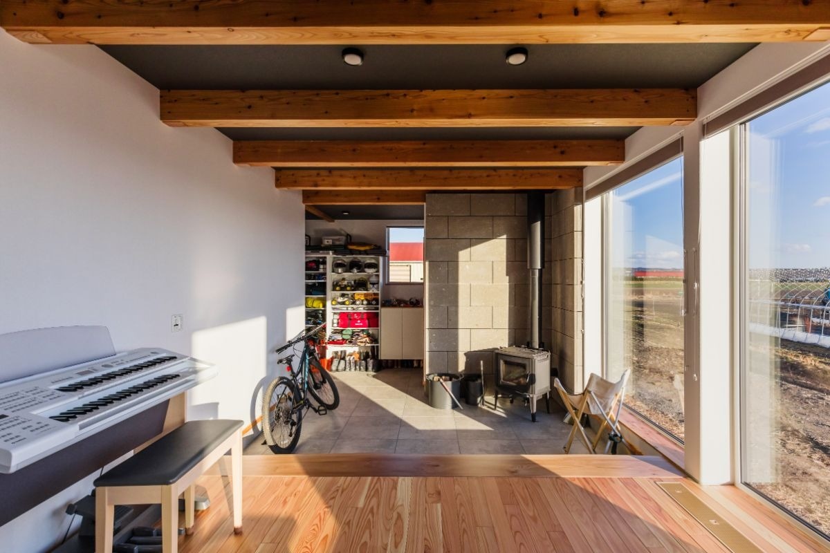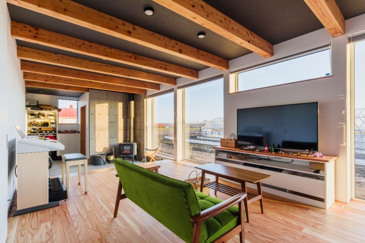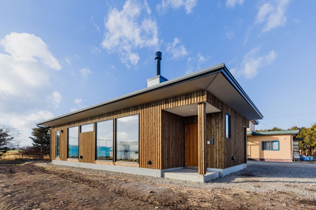 青く澄みわたる空に広大な畑風景。そんな十勝らしい風景の中に建つのは、まるで自然の一部のように溶け込むカラマツ外壁のお宅です。農家のご夫婦が選ばれたのは、小さな平屋の住居でした。こだわりの土間には薪ストーブに火が点り、夜はゆったりと趣味の時間を過ごす…シンプルな家で心豊かに暮らすご家族に、お話を伺いに行きました。