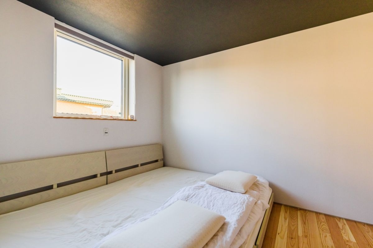 こちらはご夫婦の寝室。小さな家といっても昔の日本のように空間を細かく仕切り、片付けられるちゃぶ台や布団を使うのではなく、寝室には逆に大きなベッドを配置。ゆとりをもった空間使いで家全体が広々と感じられます。