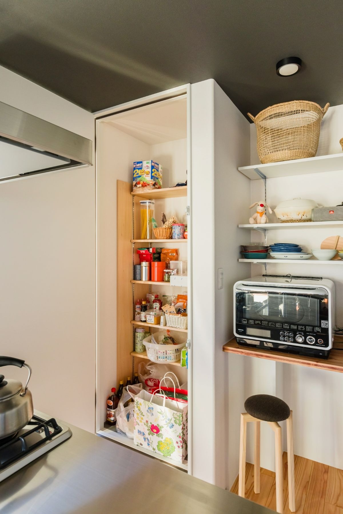 食器棚は見えている部分だけ。「必要な食器もそれほどない」と家の容量に合わせて持つものを厳選、本当に気に入ったものだけに囲まれた暮らしが実現しました。