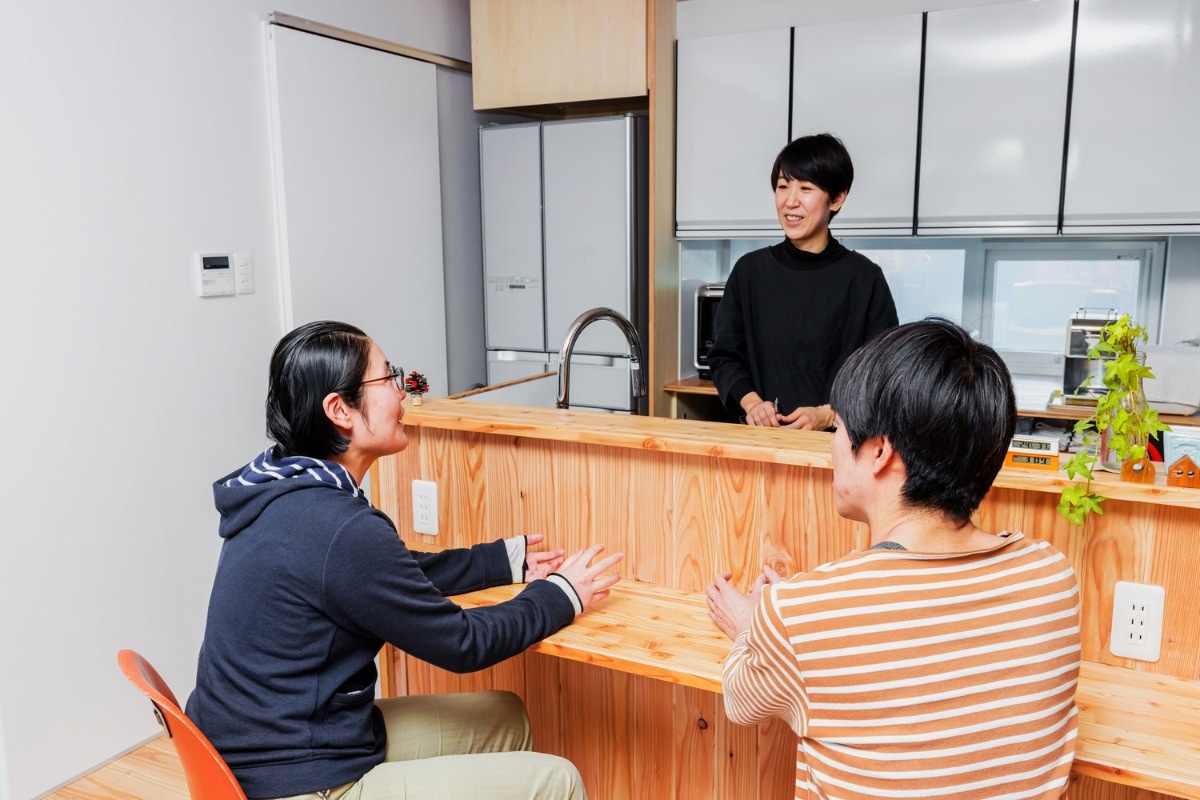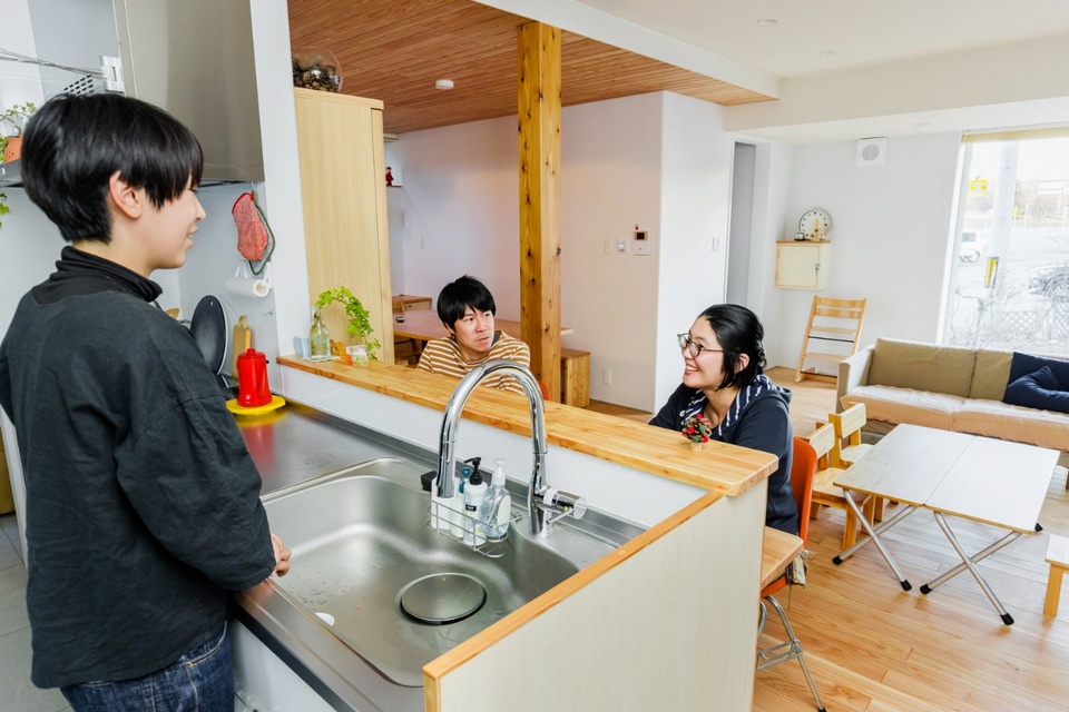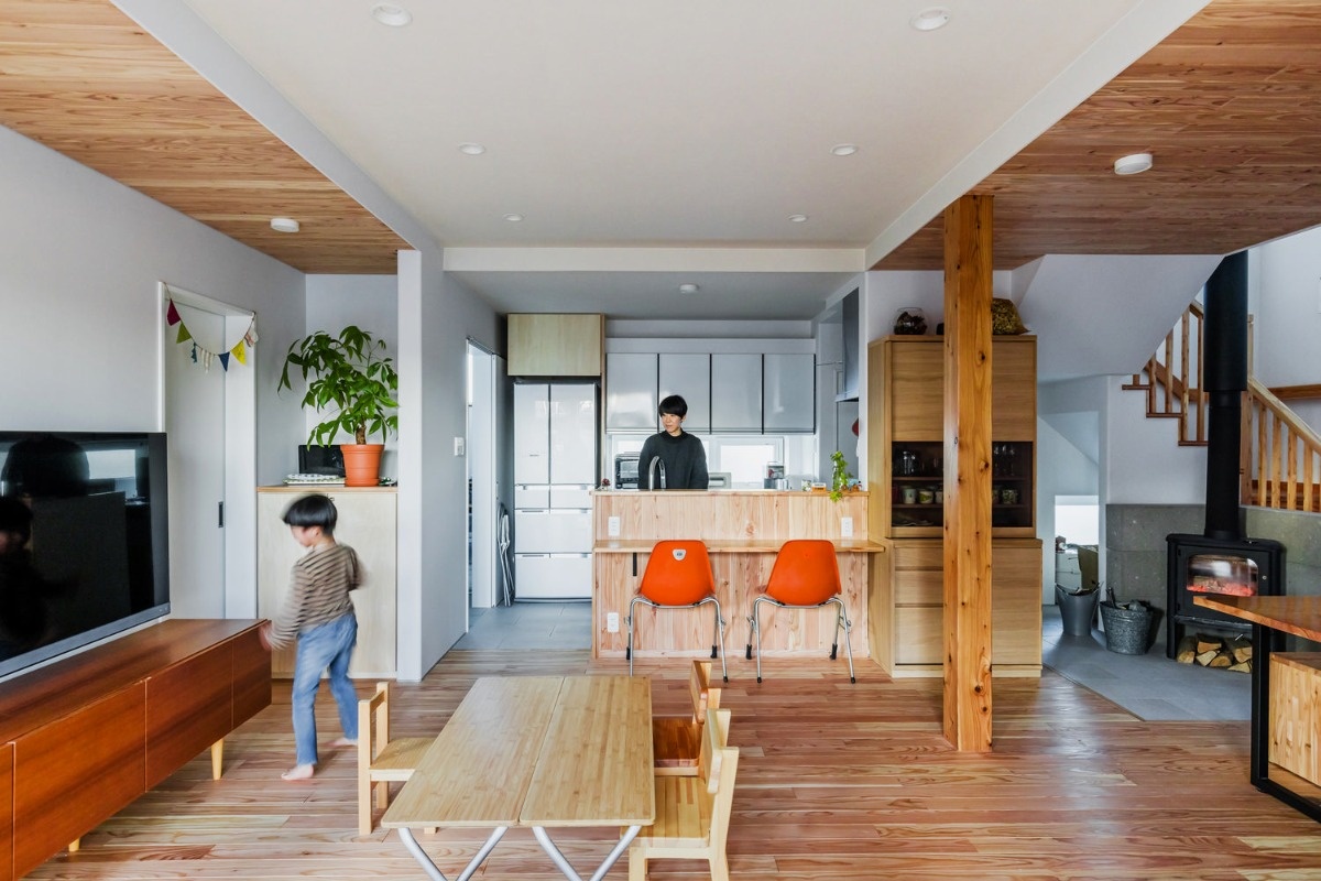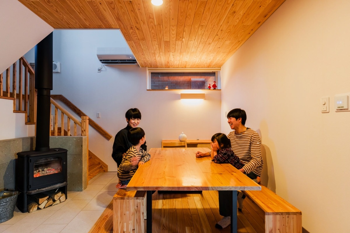 家に合わせて作ったという造作のダイニングセットでくつろぐご家族。住み心地を訊ねると「木に包まれている心地よさと落ち着きを感じます」とご夫婦のどちらからも深い満足の言葉が返ってきました。