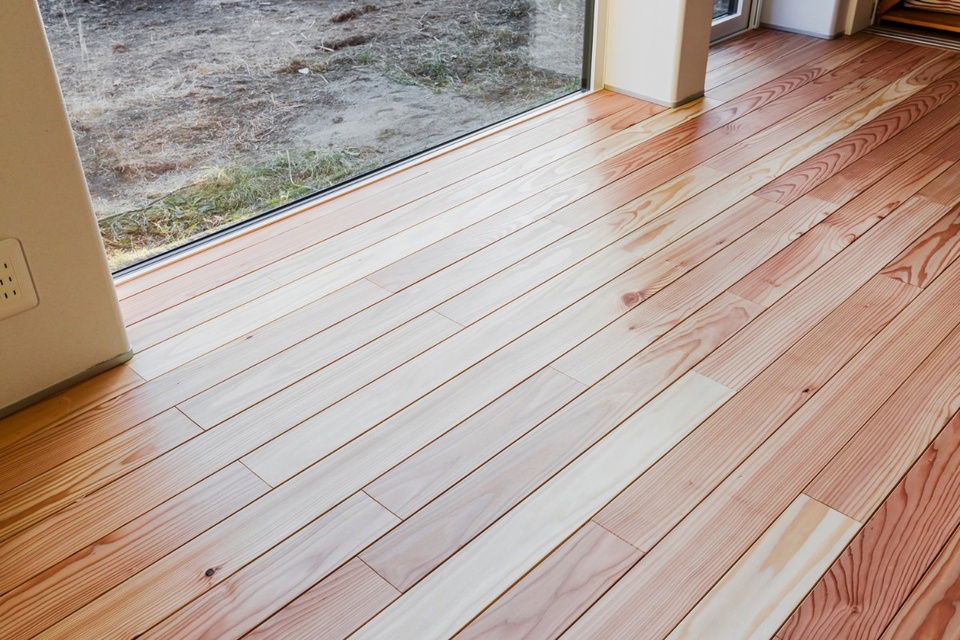 足には柔らかで滑りづらく、お子さんものびのびと走り回れるカラマツ無垢材の床。転んだり物を引き摺ったりすれば傷つくこともありますが、「それもいい」とおおらかに捉えています。