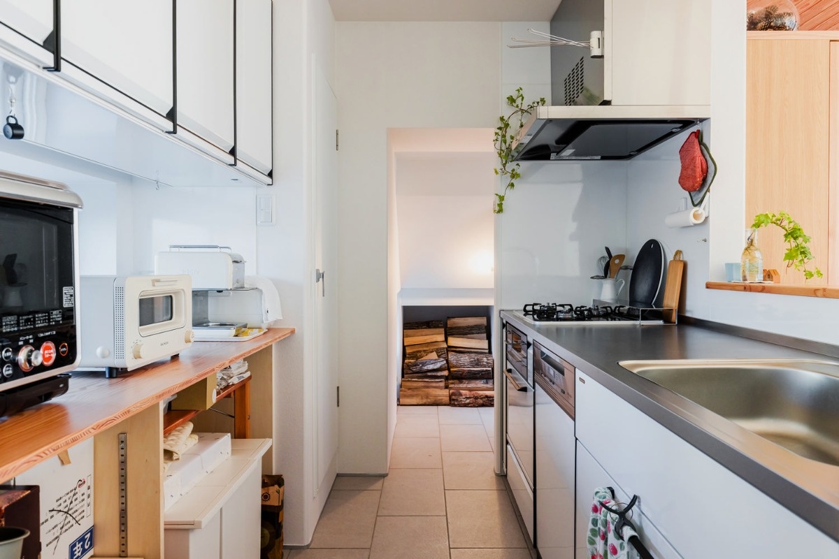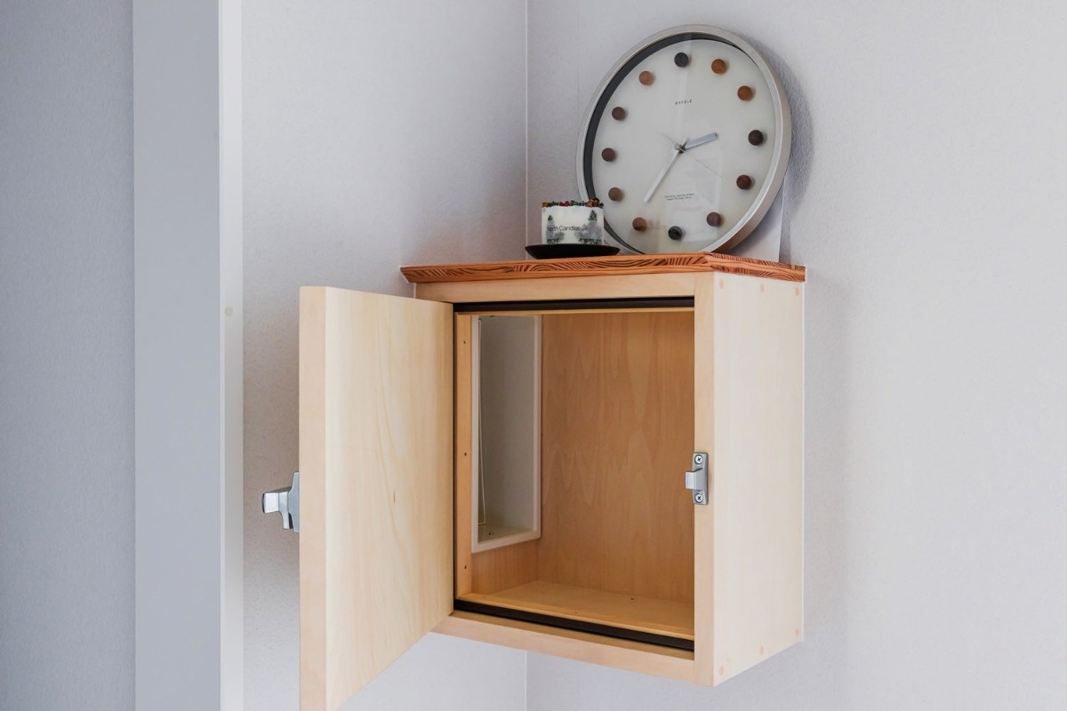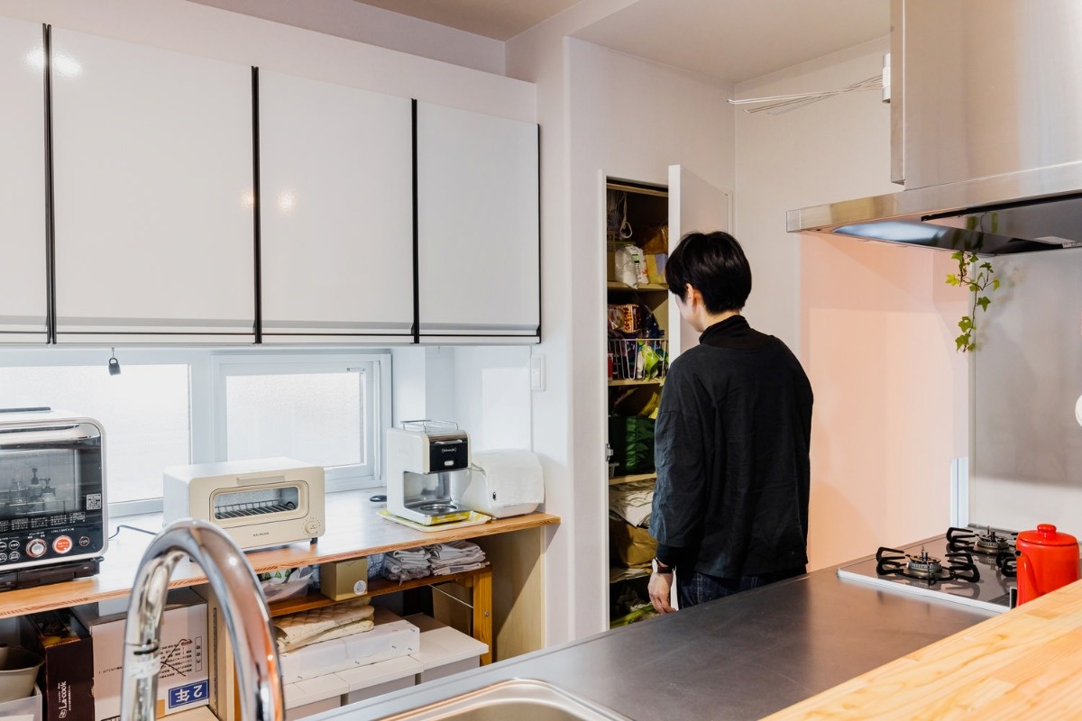 キッチンには、冬の屋外の冷気を利用できる食品庫を設置。季節により温度は変化しますが、電気を使わずに低温での保管ができます。