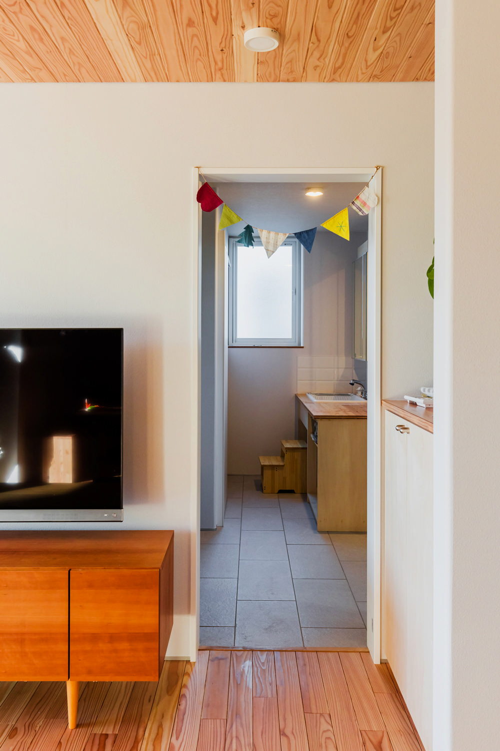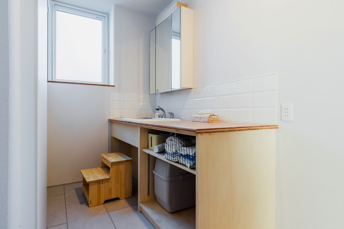 水回りの床はご夫妻の要望によりタイルに。洗面台は造作です。
