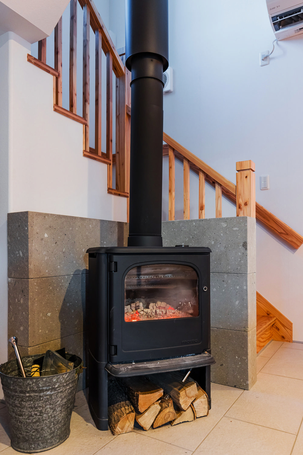 メインの暖房として使用しているのはデンマークのmorso社の薪ストーブです。冬でも夜に薪をくべれば朝まで暖か。補助暖房としてエアコンも設置しましたが、朝8時くらいには差し込んだ日光で部屋が暖まり始めるため、活躍の機会はそれほど多くありません。