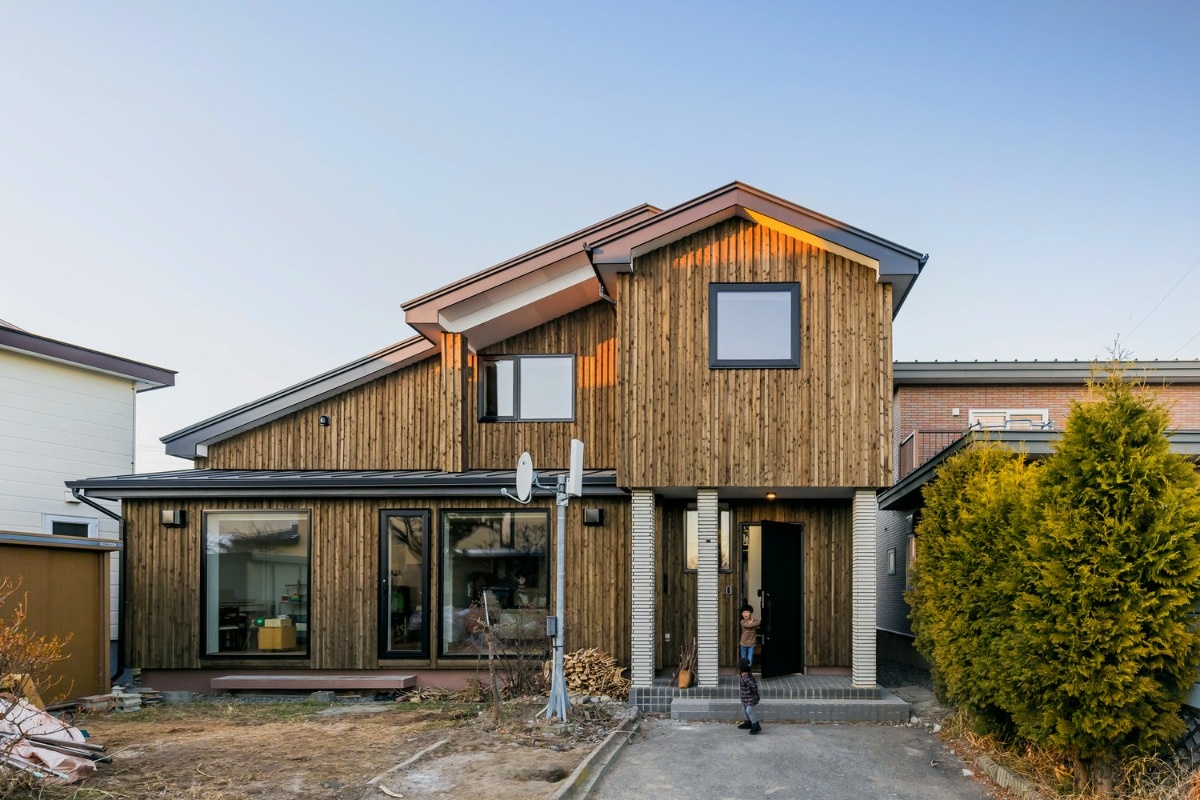 縦張りにしたカラマツの外壁が落ち着いた印象のY邸。築30年以上になるご主人の実家の、基礎と柱などの骨組み(躯体)を残してリノベーションしました。ご夫婦と二人のお子さんが暮らしています。