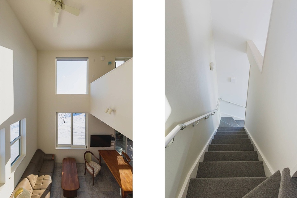 2階との間には明るい吹き抜けがあります。東側の壁上部はスクリーンとして利用するためにあえて窓をつけずに残しました。