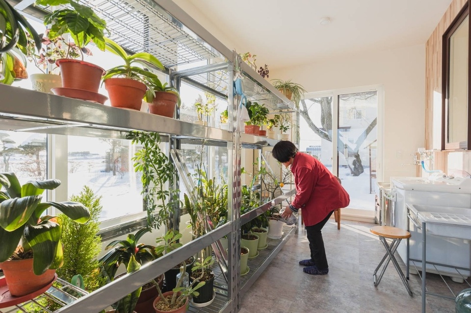 サンルームで植物のお世話をしているのは、農業のかたわら英会話講師としても活躍している奥様の真幸子さん。温室には明るい日差しが差し込み、暖房を切っていてもあたたか