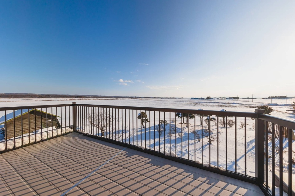 広々としたデッキからは山川農場の畑が見渡せます。夏には十勝川の河川敷で行われる花火大会もよく見えるそうです。「四方を見られるのは本当に気持ちがいいよね。夜はビアガーデンができるよ」(山川さん)