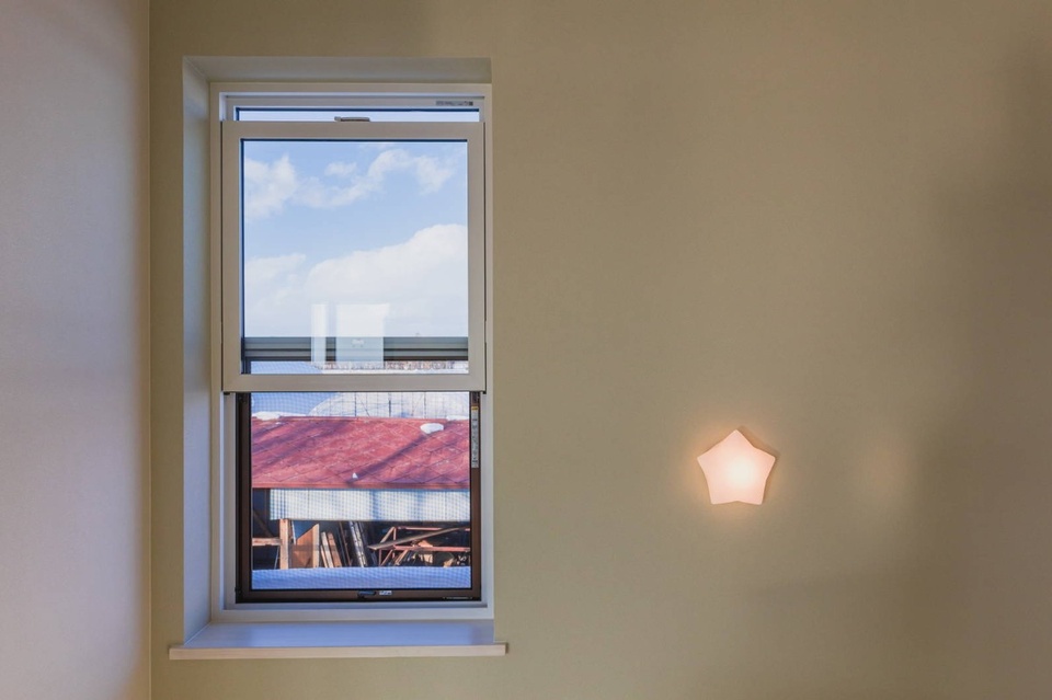 壁紙の下にはタイガーハイクリンボードという石膏ボードを使用。ホルムアルデヒドを吸収・分解する機能があり健康面も安心です。赤坂建設ではこちらの石膏ボードを標準採用しています。やわらかな星型の照明もあたたかな印象です。