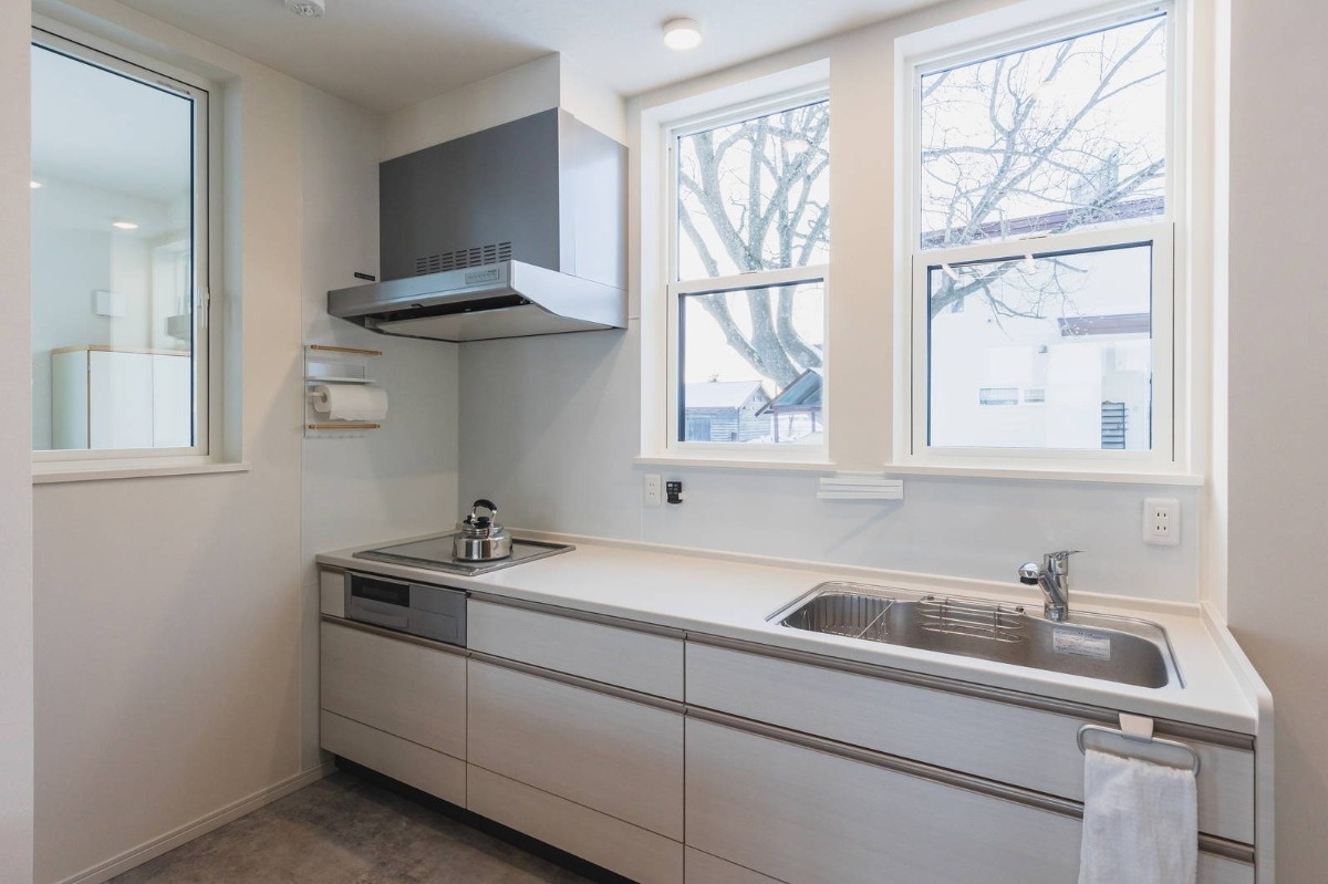 キッチンは、お手入れのしやすいシンプルなものを選びました。窓からは「辛夷(こぶし)庵」の由来となった大きなコブシの木を見ることができます。