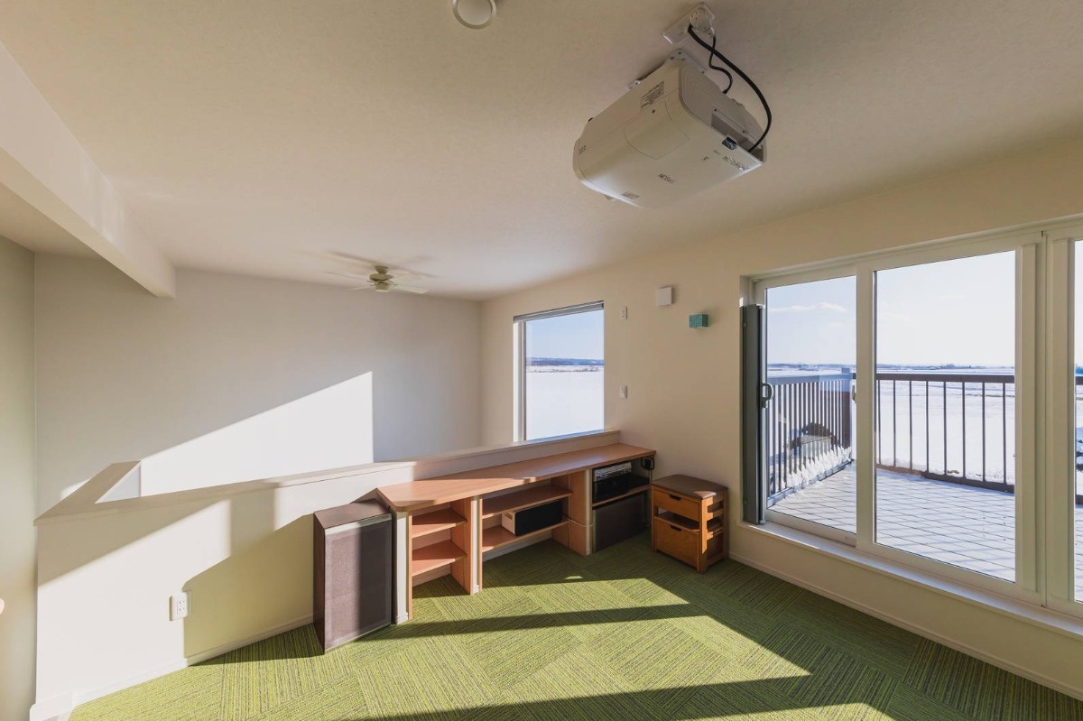 「みんなの家だから、壁一面に大きく映して映画会なんかをしても面白いよね」と、フリースペースはホームシアターも兼ねた空間に。プロジェクターを設置し、スクリーン用の壁紙を使用しました。