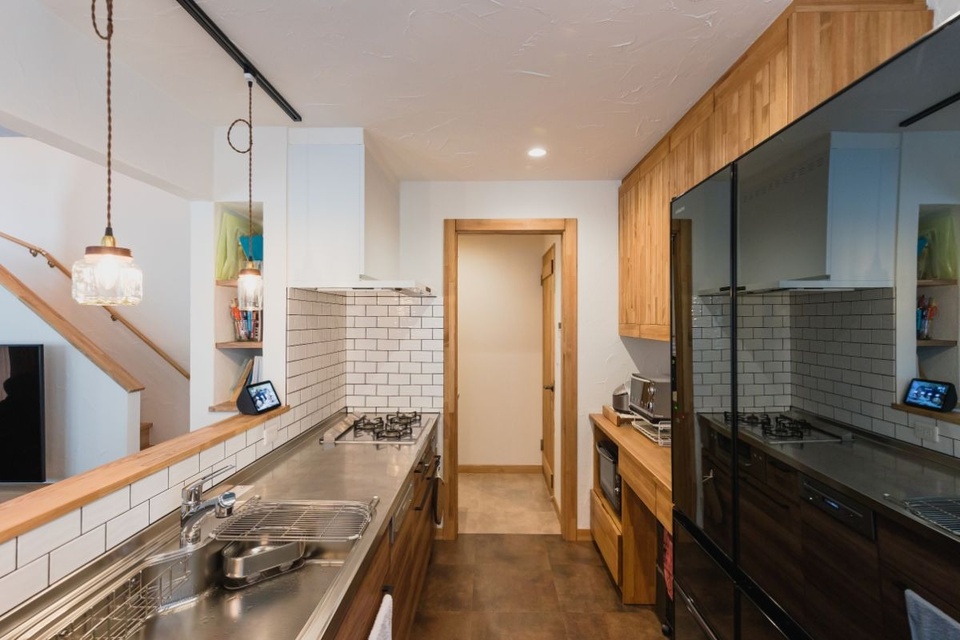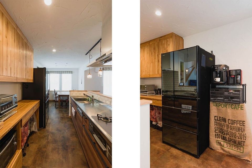 「最初はもっと優しい印象のカントリースタイルがいいかなと思っていたんです。でも、この黒くて大きな冷蔵庫を置くことが先に決まっていたので、これが浮かないテイストにしたいね、と。色々考えてイメージを膨らませた分、お気に入りの空間になりました」と奥様。置く予定の電化製品までしっかり考えてから作ることで、全体が調和するインテリアになりました。