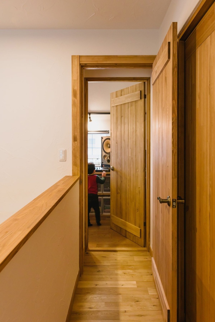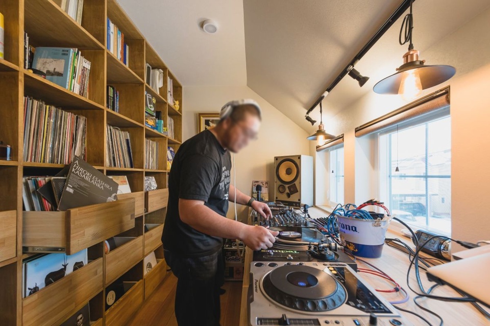 趣味でDJをされているというご主人。計画当初から関係機材を収められる書斎の実現を希望していました。気になる防音性能はというと、2枚の扉を完全に閉めてしまえば隣の部屋にいてもほとんど音が気にならないレベル。天井の勾配が音を反響し、厚みのあるサウンドに聴こえるところもお気に入りです。
