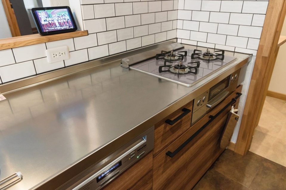各社のショールームを見て回って決めたというクリナップのステンレスキッチン。「収納が多かったことと掃除がしやすい点が魅力でした。ガス台と食洗機も好きなものを選んで、料理をするのが楽しくなりました」(奥様)。