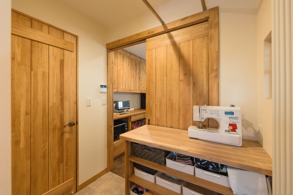 キッチンと洗面・脱衣所の間には別途乾燥室も設けました。洗濯物を畳むほか、アイロンがけやミシンがけなども行える作業カウンターを作り、まとめて家事を行えるようになっています。