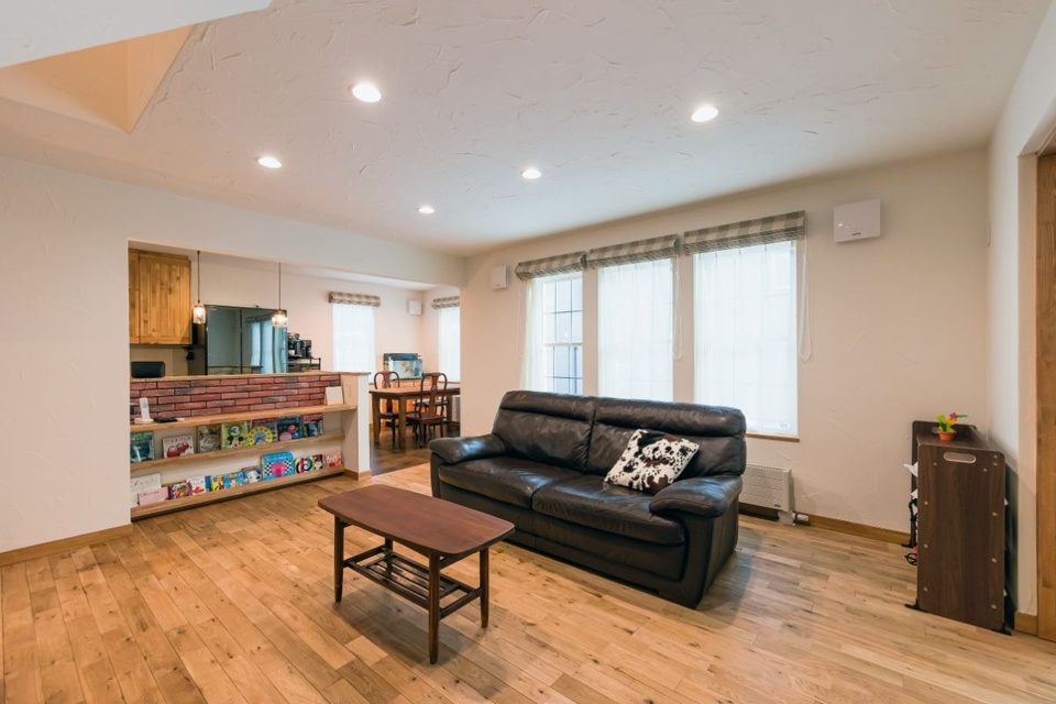 すっきりとした空間が心地よいリビングルーム。三連窓と無垢床が穏やかな印象を与えます。手前にはお子さんのプレイスペースとして使用している和洋室、奥にはキッチンとダイニングがあり、用途別に部屋を分けながらも家族の気配が感じられる造り。左手には階段と洗面所が続いています。