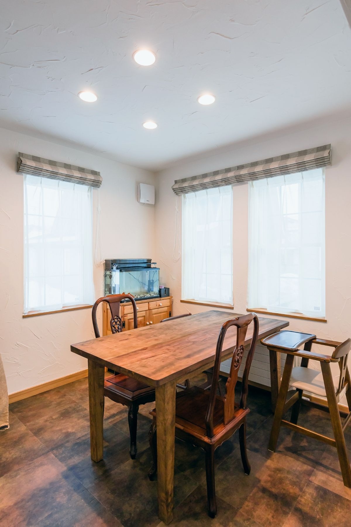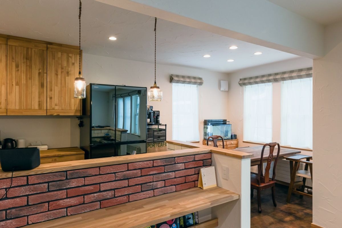 こちらはキッチンとダイニング。温かみあるカントリーテイストの中に、レンガ調タイルの硬質な素材感がマッチしています。