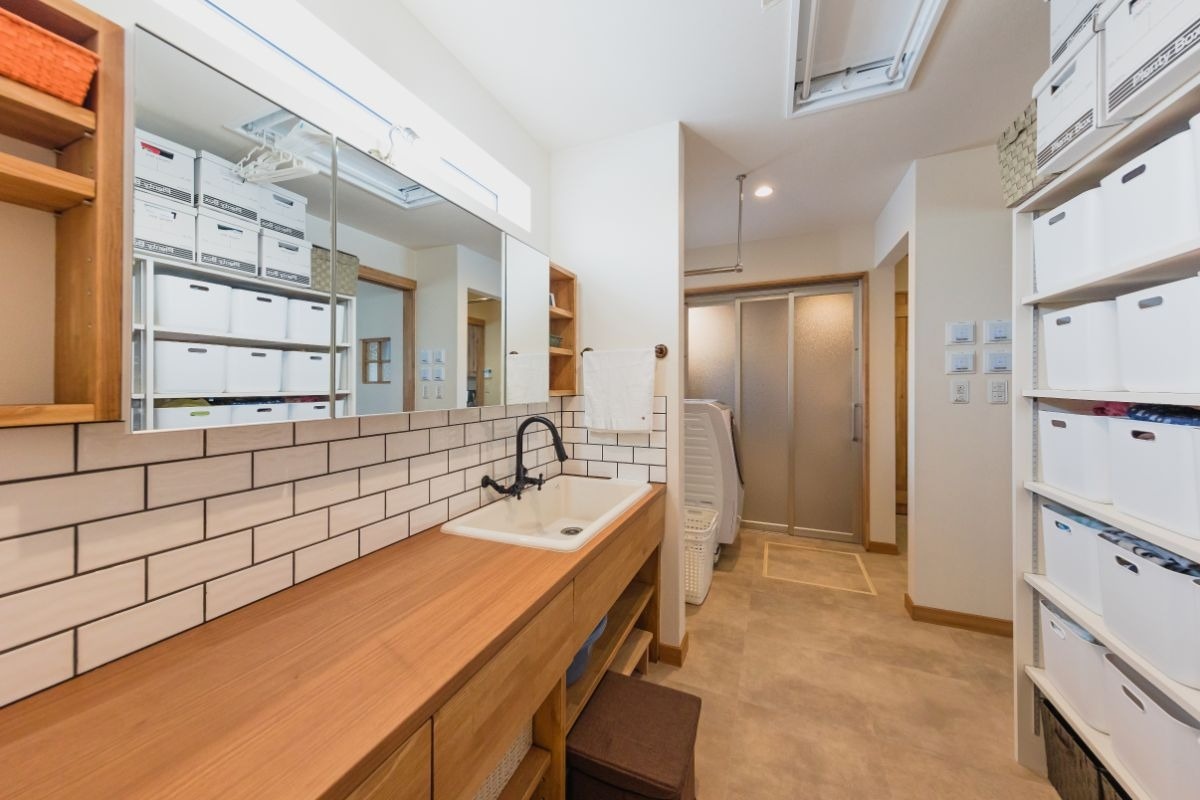 キッチンから洗面所、浴室、リビングはすべて繋がっている回遊式の間取りです。「家事動線にはこだわりました。数々のオープンハウスを見てきましたが、朝日社長の作る家は家事がしやすくなりそうなアイデアが沢山ありましたね」と奥様。実際に家事がしやすくてとても助かっているそうです。広いカウンターの洗面台は、家族で並んで朝の支度ができるようにと作ってもらったもの。後ろの棚も造作で、物が整然と収まるようになっています。