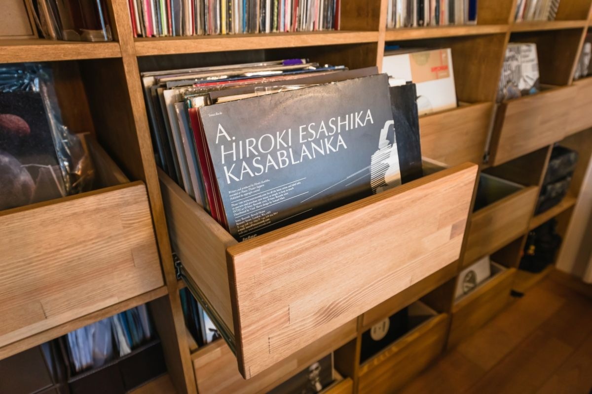 レコードを収納する棚はもちろん造作。レコード店などで見るような引き出し型で、収納とディスプレイを兼ねています。