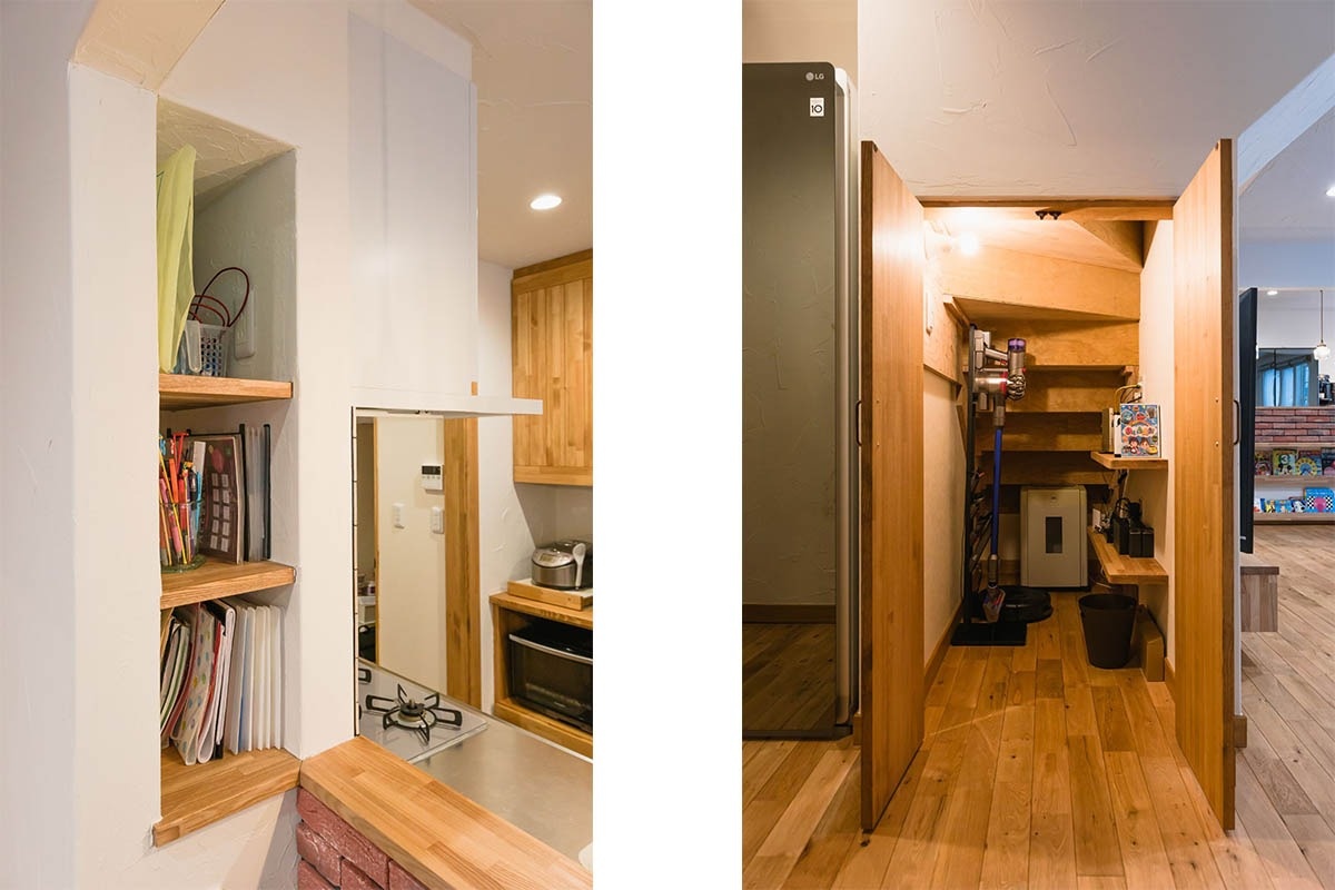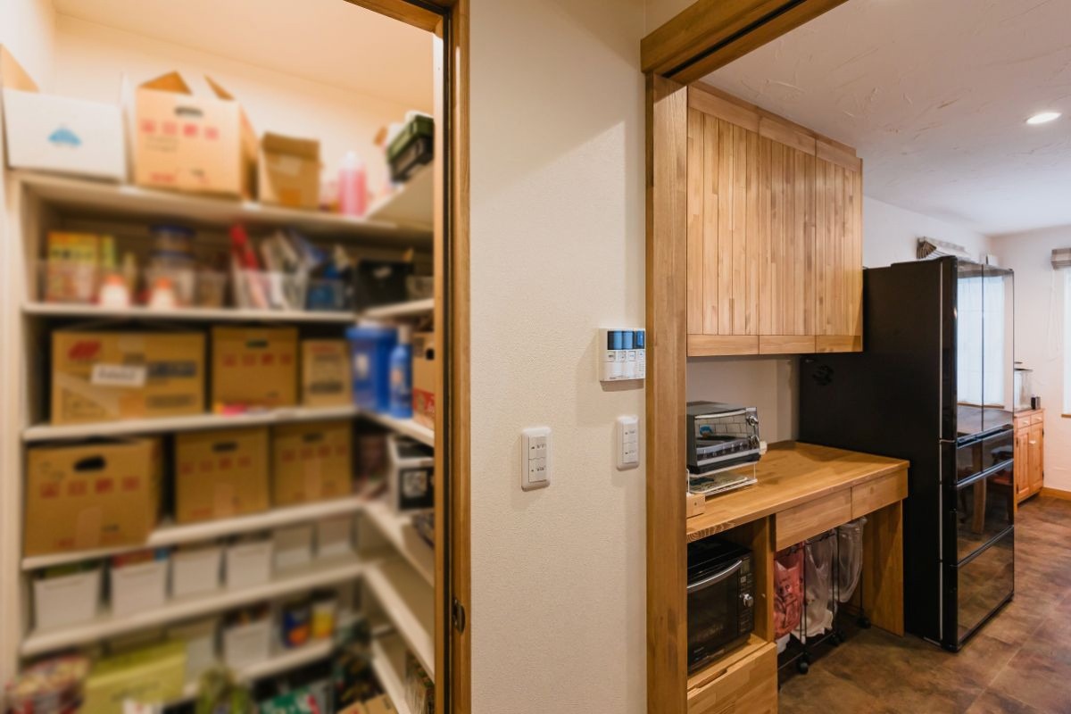 まとめ買いをすることが多く、以前住んでいた家では収納しきれない食材に困っていたというUさん。以前、朝日社長の手掛けた家にあった断熱パントリー(保冷庫)に「これだ!」と思ったのだそうです。冬場は外気を引き込むことで内部をひんやりと保ちます。デザインも使い勝手も大満足のキッチンになりました。