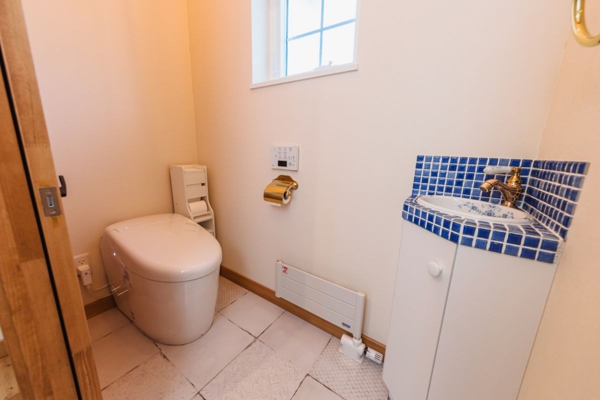 トイレはすっきりとした見た目と掃除のしやすさからタンクレス一択だったのだそう。手洗いのタイルは2つの候補の中から3歳の息子さんが選んだもので、ボウルや蛇口と合わせて「とても可愛く仕上げてもらいました」と奥様。息子さんもお気に入りです。