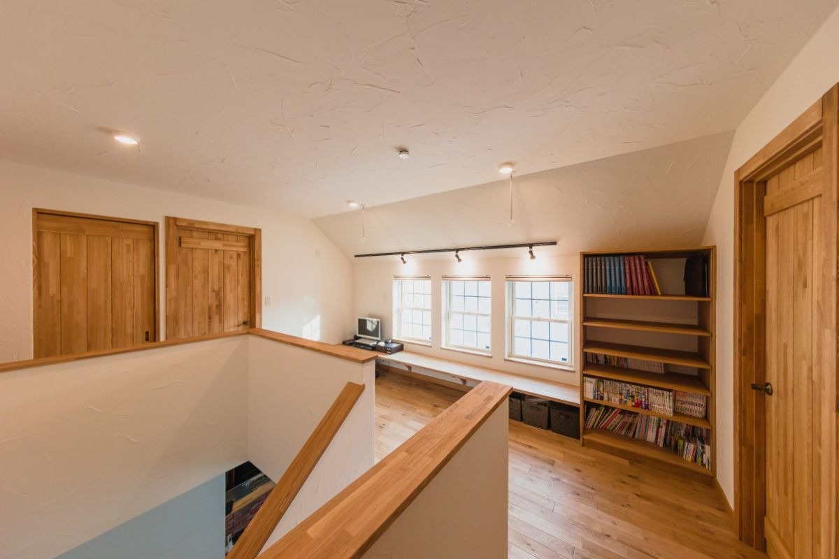 階段を上りきるとフリースペースが広がっています。「最初は広い吹き抜けを作る予定でしたが、ホールに変更したんです。結果的には階段上部分の吹き抜けができたので、1階と2階の繋がりが感じられるように、という希望と、オープンになりすぎないように、という希望の両方が叶いました」(奥様)