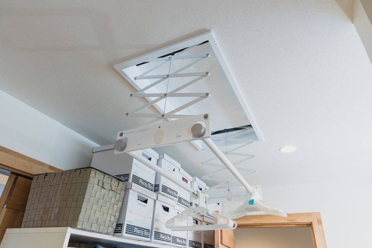 洗面所には、使う時だけ引き出せる室内物干しユニット(パナソニック「ホシ姫サマ」)が。洗濯物を干した後は天井近くまで電動で引き上げることができるため、乾燥させる間もすっきりした空間を保つことができます。
