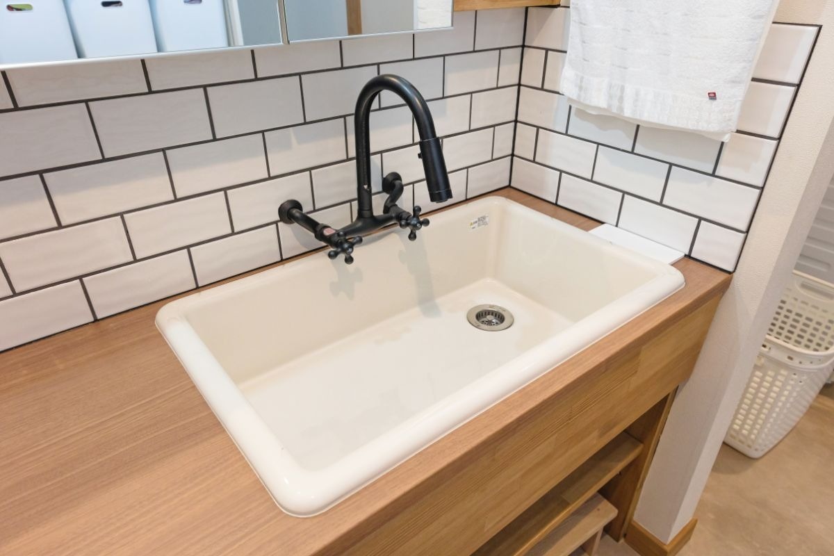 大きくて深さのある陶器製の医療用シンク。お子さんの洗濯物などを洗う際に使いやすそうなものを選びました。蛇口は掃除しやすいよう、壁付けのものを希望。数少ない壁付け水栓の中からインテリアコーディネーターの八木さんが提案したものは空間の雰囲気にもマッチし、「イメージ以上に素敵になった」とご夫婦も笑顔です。