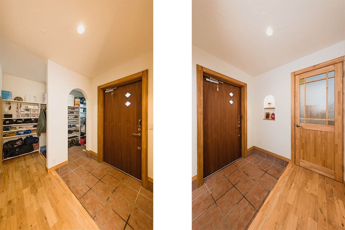 玄関には、シューズだけでなく鍵や小物などさまざまなアイテムが収納できる大きな棚を設置しました。玄関・シューズクローク・ホールを合わせると約5.5帖と、複数人で同時に入っても滞らない広さです。