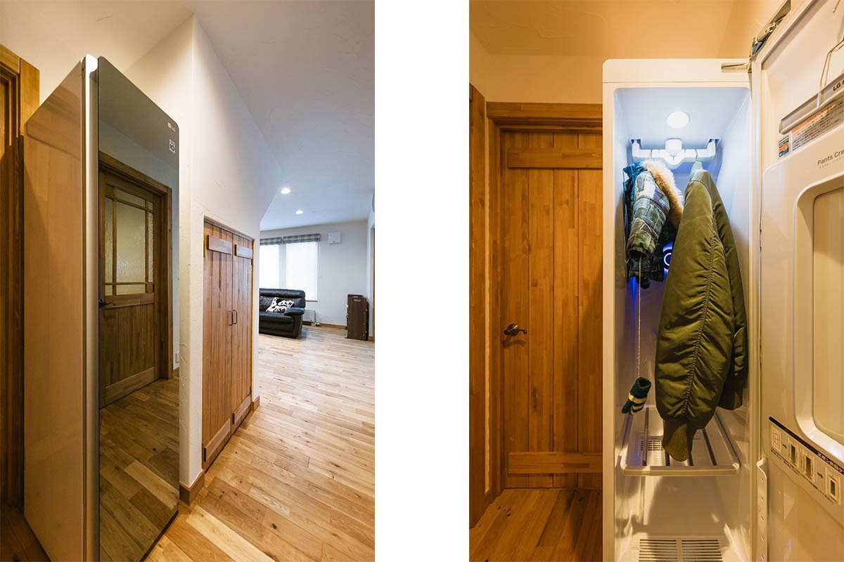リビングに入るとまず「LG Styler(LGスタイラー)」というホームクリーニング機がありました。衣類をハンガーにかけて入れておくと、外出先で付着した汚れを落としたり、シワを伸ばしたりすることができます。毎年シラカバ花粉に悩まされるご主人は、住宅を建てる前からこの機種を置くと決めてスペースを作ったのだそう。お部屋の奥に花粉を持ち込みません。