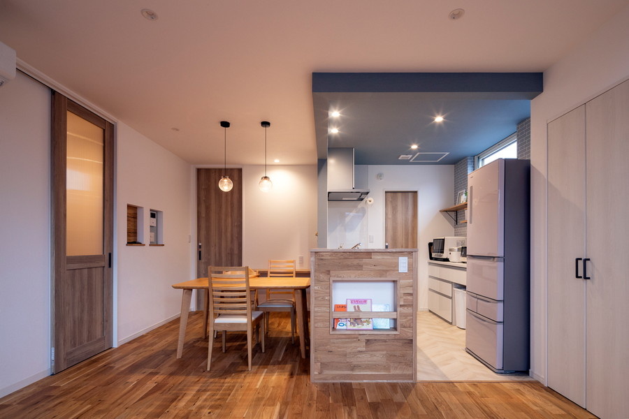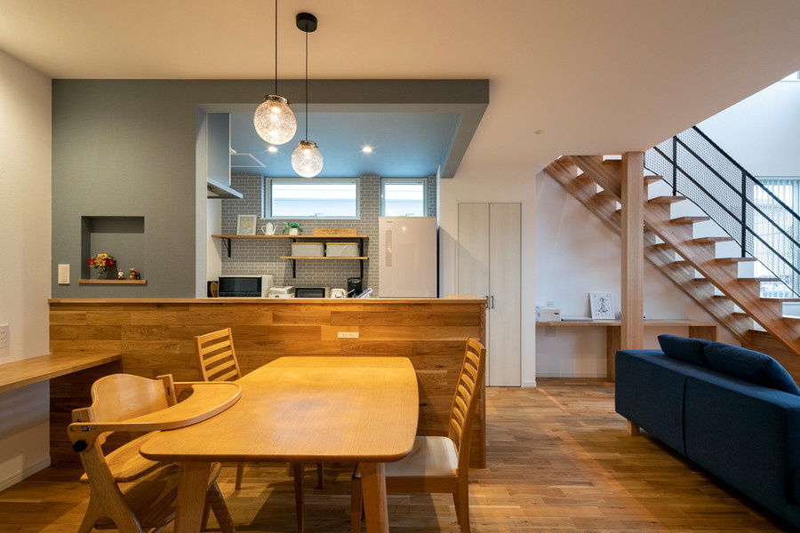 北欧のカフェをイメージしたダイニングキッチン。カウンターの側面にはマガジンラックがついています。フローリングとキッチンの腰壁は無垢のナラ材を使用。