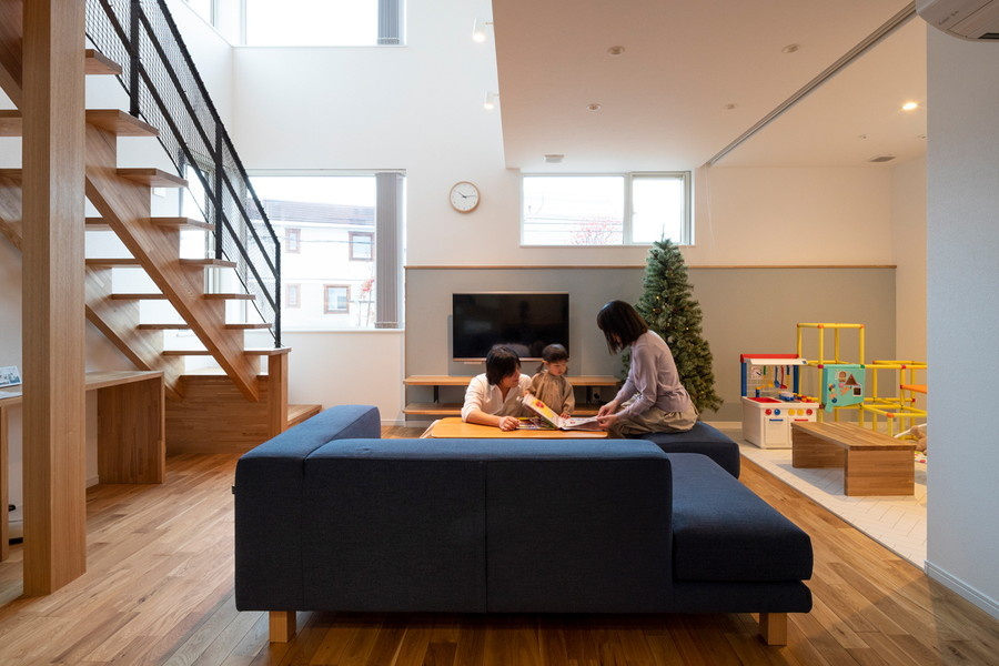 吹き抜けから明るい日差しが降り注ぐリビングは家族みんなの憩いの場。休日はご夫婦そろって家事をしたり、お子様と遊んだりしながらゆっくり過ごします。