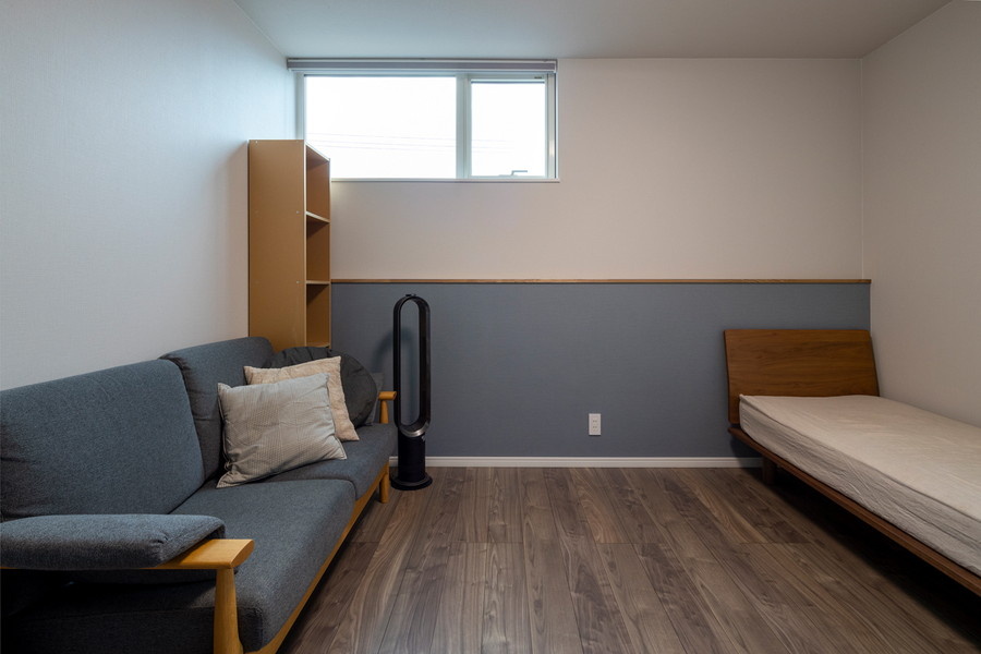 プライベートルームがある2階。寝室はダークな色合いのウォルナット風フローリングとブルーグレーの壁でシックにまとめました。高窓から朝の光が入り、目覚めも爽やか。