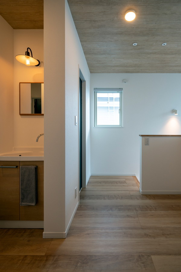 2階ホールの一角にも小さな洗面スペースを設けています。身支度する場所が2ヵ所に分散され、朝の準備がスムーズ。
