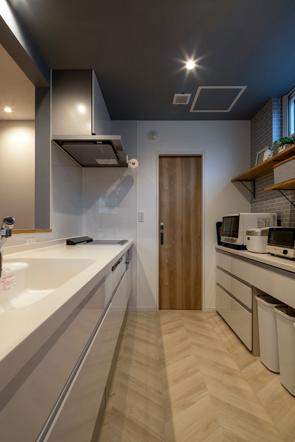 レトロ調のヘリンボーンのフローリングが遊び心を感じさせるキッチン。背面の壁にインダストリアルなレンガ調タイルを貼り、ヴィンテージ感を添えました。