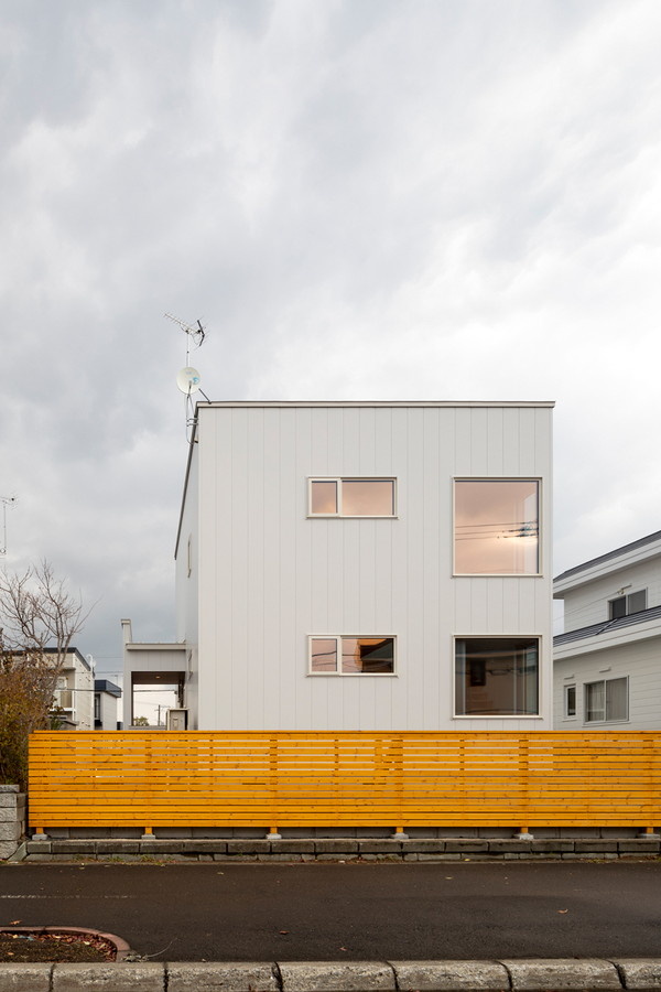 Iさんご夫妻のこだわりが詰まったお住まいは白のガルバリウム鋼板貼りのシンプルモダンな外観。住宅街にある通りに面した敷地なので外から家の中が見えないよう窓の位置を全体的に高めに設計しています。