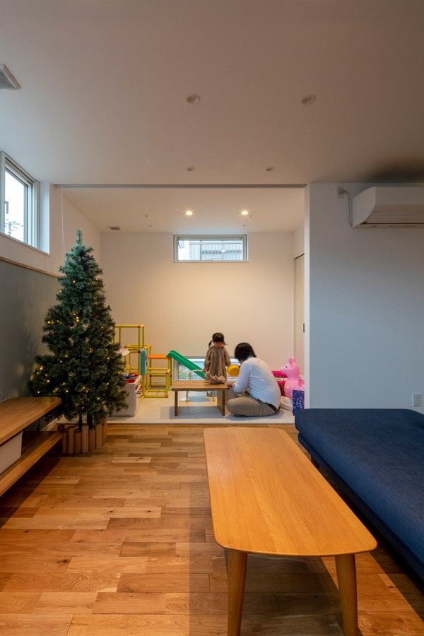 リビング横の約3帖の小部屋は遊具を置き、プレイルームとして使っています。リビングとの境に大きなツリーを置くことを想定し、設計段階からスペースを確保しました。