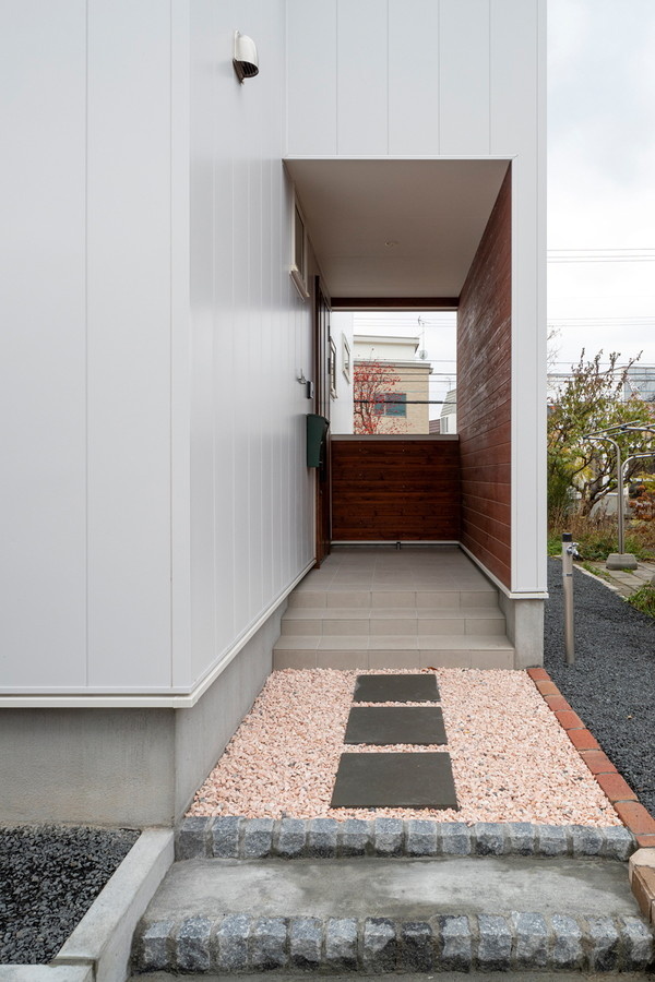 石やタイル、レンガなどさまざまな素材を組み合わせた個性的なアプローチ。玄関ポーチの内壁に木を使い、温かみのある上質なデザインに仕上げています。