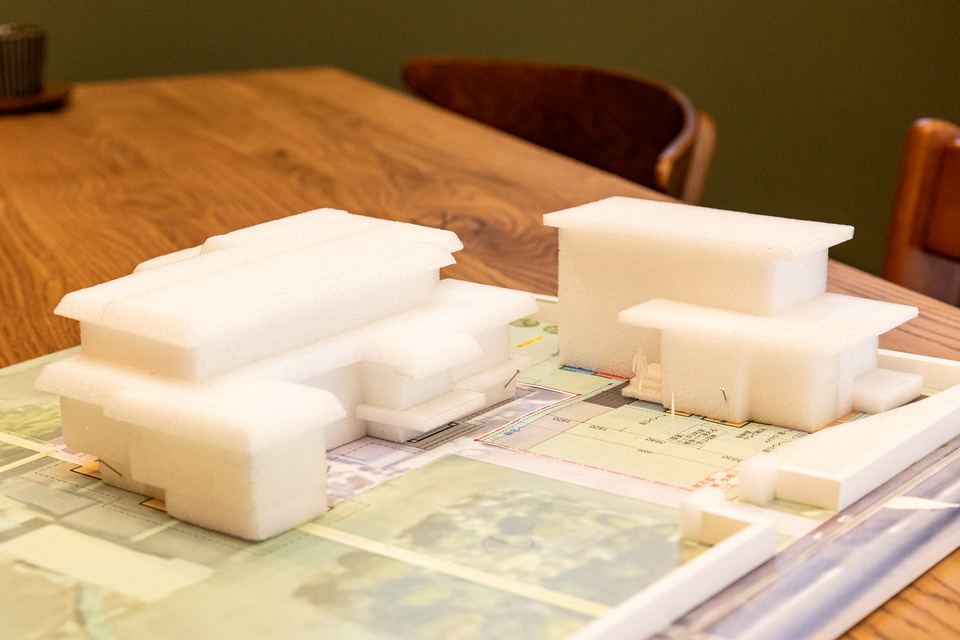 右がT邸、左がTさんの実家の建築模型。この模型を製作したのは設計士の一原寿寛さんです。