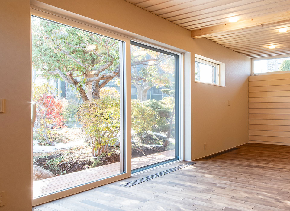全ての窓に高い断熱性能を誇るトリプルサッシを採用しています。テラスに面したリビング・ダイニングの大きな窓は、引き違いではなく片引きのスライディングサッシ。しかも軽くて、片手の指で開けることができます。ここから眺める庭も見事です。