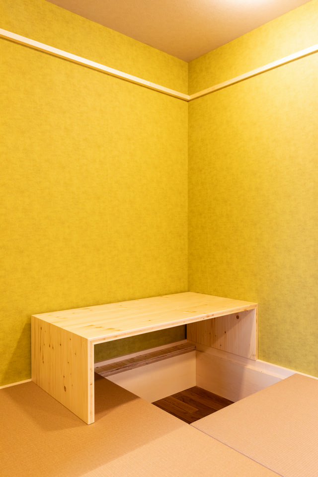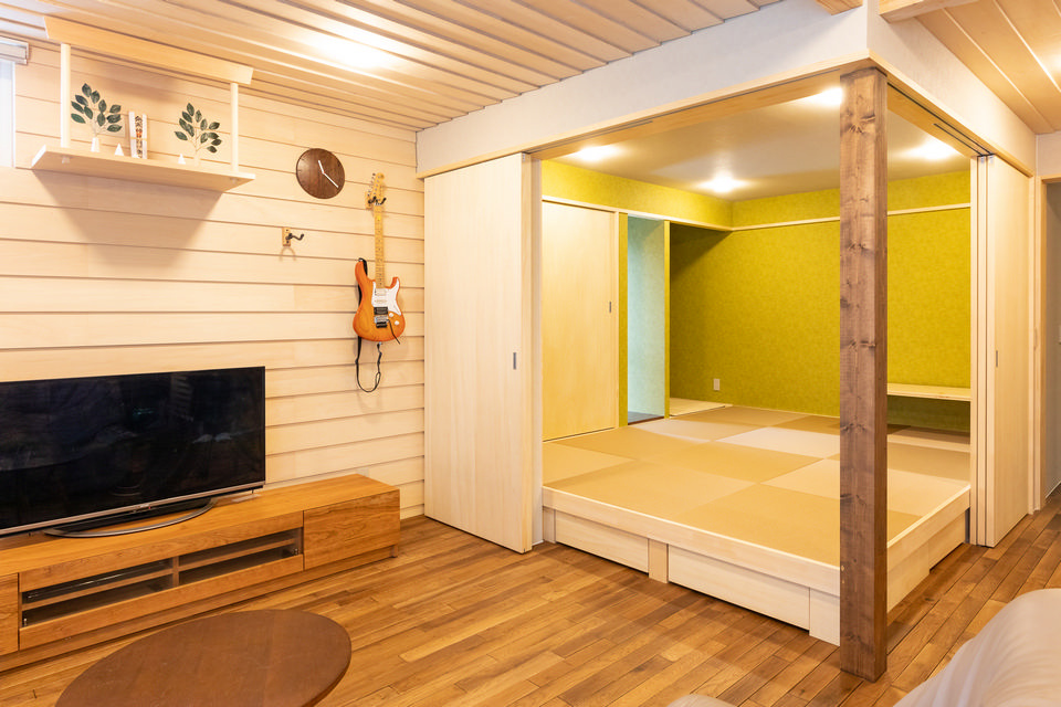 抹茶色の壁と12cm角の大黒柱が映える和室は、6畳の可動式小上がり。床からの高さは約30cm、引き出し収納も設置されています。リビングの延長の空間として、和室がほしかったというTさん。「老後は1階で生活を完結できるように、段差を解消してバリアフリーにしたい。そのため将来、撤去しやすい可動式にしてもらいました」。