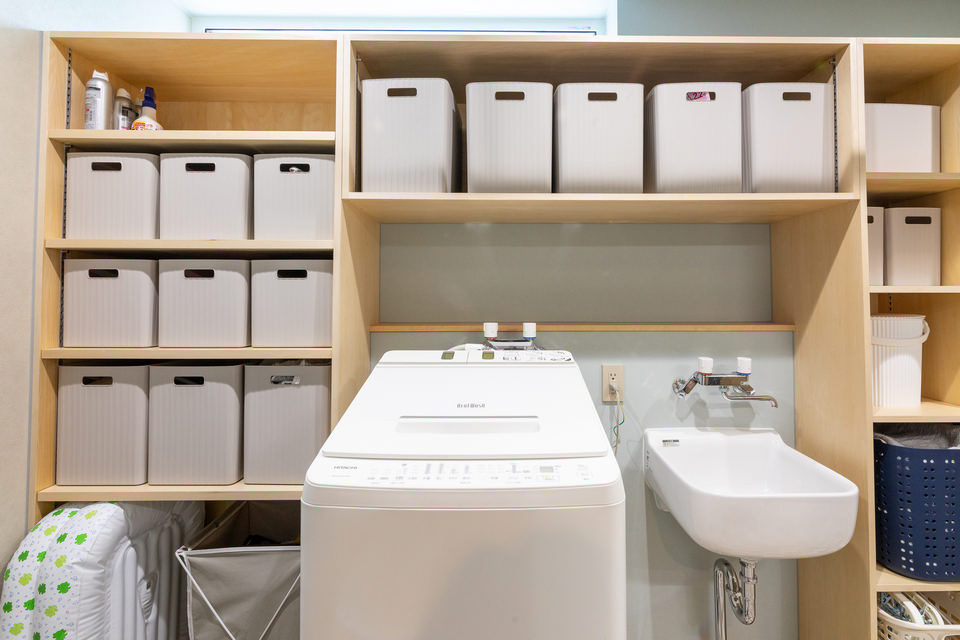広い洗面脱衣室。洗濯機とスロップシンクを囲むように、造作の収納棚をずらりと設けています。