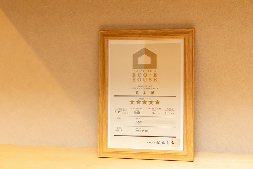 T邸の玄関に飾られている、札幌版次世代住宅基準「トップランナー」の認定証。UA値0.17W/m2K、C値0.5cm2/m2。札幌版次世代住宅基準の最高性能グレードの証です。