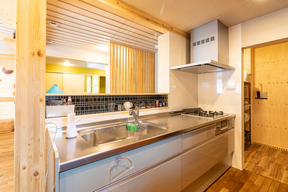 対面式キッチン。手元が見えないようにしてほしい、との要望に応えて、キッチン前にダークグリーンのモザイクタイルを張った奥行20cmのニッチを設けています。右手は広々としたパントリーです。