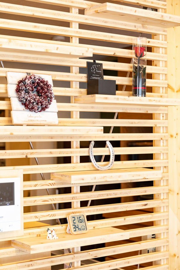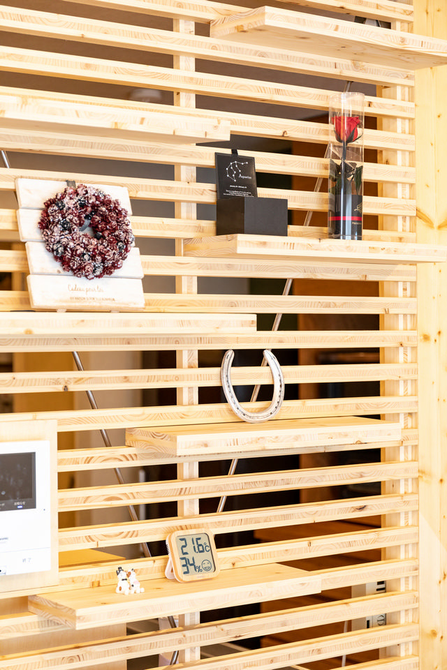 木の表情でリビング・ダイニングにアクセントを添える飾り棚。横ルーバーがおしゃれなうえ、圧迫感もありません。互い違いに設置した棚は、飾るものに合わせて移動できる可動型です。