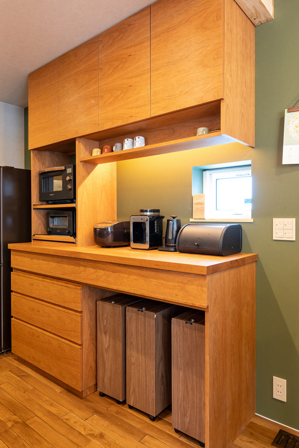 ダークグリーンの壁にマッチしたカップボードは、当別町の家具工房「旅する木」にフルオーダーしたもので、美しい木目と質感が素敵です。材質はブラックチェリー。