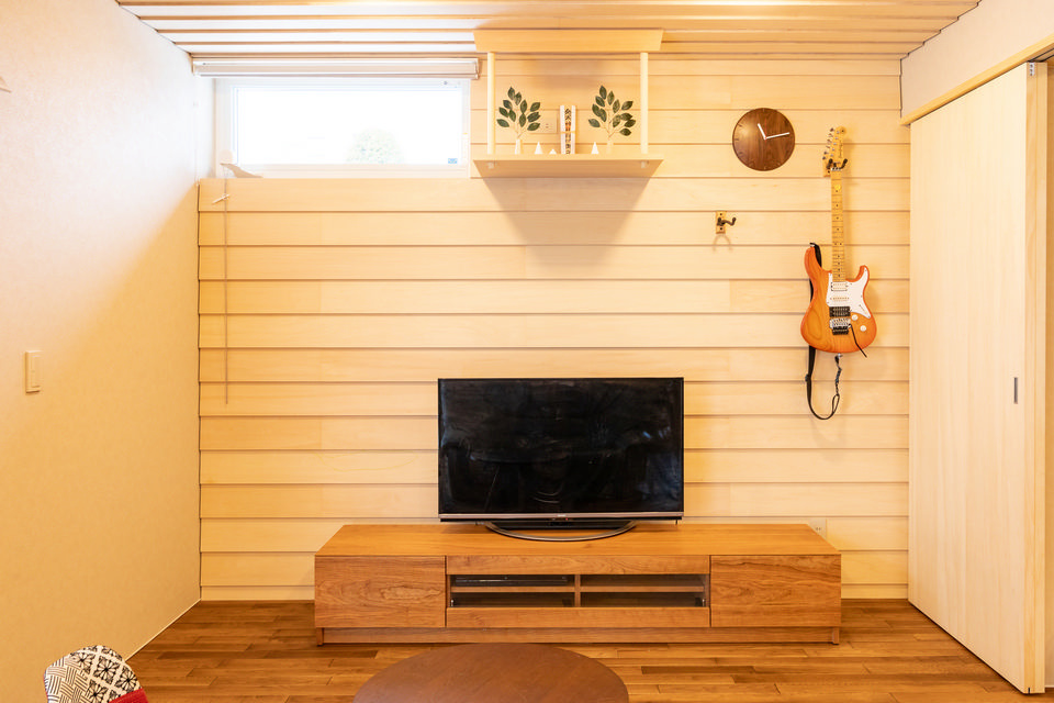 テレビの背面の壁は、天井と同じ下見板張りで仕上げています。完成した木の壁面に神棚を設置すると、色調も質感もぴったりで素晴らしい一体感が生まれました。