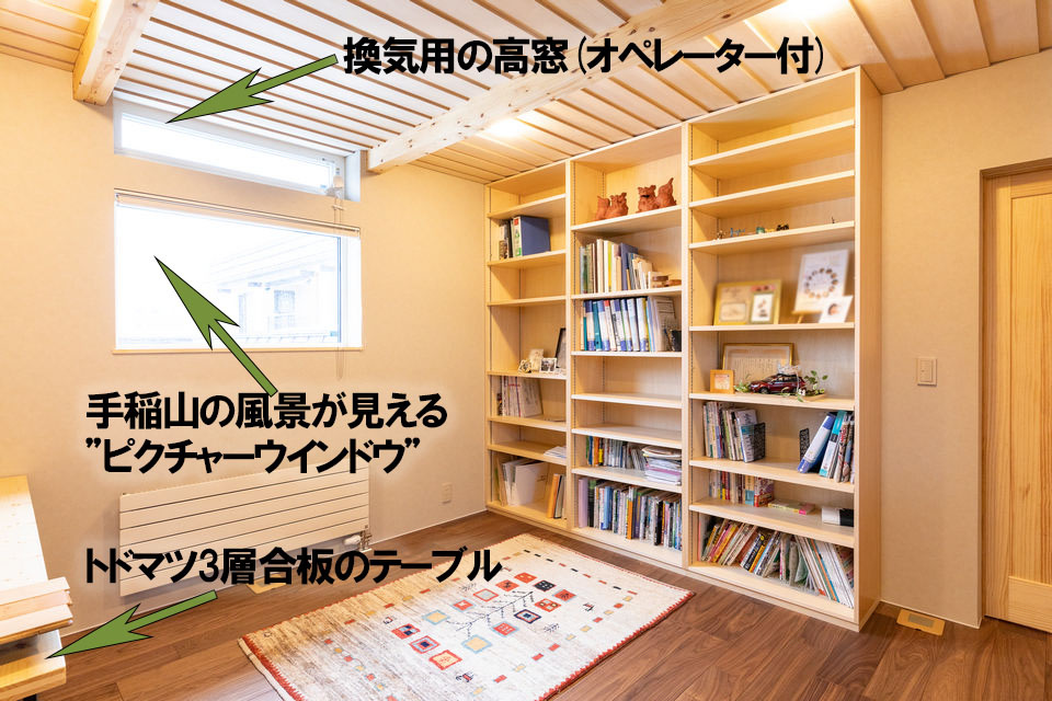 2階には8畳のフリースペースが広がります。将来的には、左端に写っているトドマツ3層合板のテーブルを使い、テレワーク用に使うことも想定しています。本棚はTさんのご要望に応える形で造作しました。天井までたっぷり収納できますし、将来のレイアウト変更を考えて移動して使うこともできる分割式にしています。
